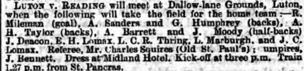 “The Luton Town Football Club will meet an eleven of Reading in the first round of the English Challenge cup ties.  The Luton team is a thoroughly representative one, and a close contest in anticipated.  We are requested to state that by order of the National Association the match must commence at three o’clock instead of half-past three, as previously announced”.