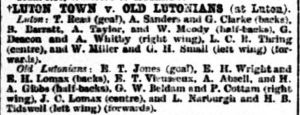 “Played on the recreation ground, Dunstable on Thursday afternoon and resulted in a win for the visitors by six goals to one.  The home team had J. Challen and A.G. Henfrey (Wellingborough Grammar School), but several of the Grammar school boys were also engaged, and the eleven was thereby considerably weakened.  The visitors played well together, while several members of the Dunstable eleven showed conspicuously good play.  The teams were as follows: Luton Town: H. Macartney, goal; A. Sanders and A. Martin, backs; J. Wright, H. Munroe and J. Moody, half backs; G. Deacon, centre; E. Wright and W. Miller, right; H. Whitby and A.E. Smart, left.  Mr Thring’s eleven; A. Medcraft, goal; J. Clarke and E. Elliott, backs; T. Keeling L.C.R. Thring and E. Fox, half backs; A.G. Henfrey, centre; J.B. Challen and J.W. Thurnham, right; L.C.W. Thring and E. Gladwell, left, forwards”.