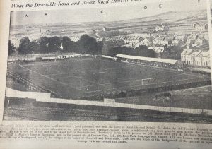 The chimney at Henry Brown’s Timber yard was being constructed on the site of the Dallow Lane ground. There must have been scaffolding up and some fans and an intrepid cameraman scaled the heights for a better view.