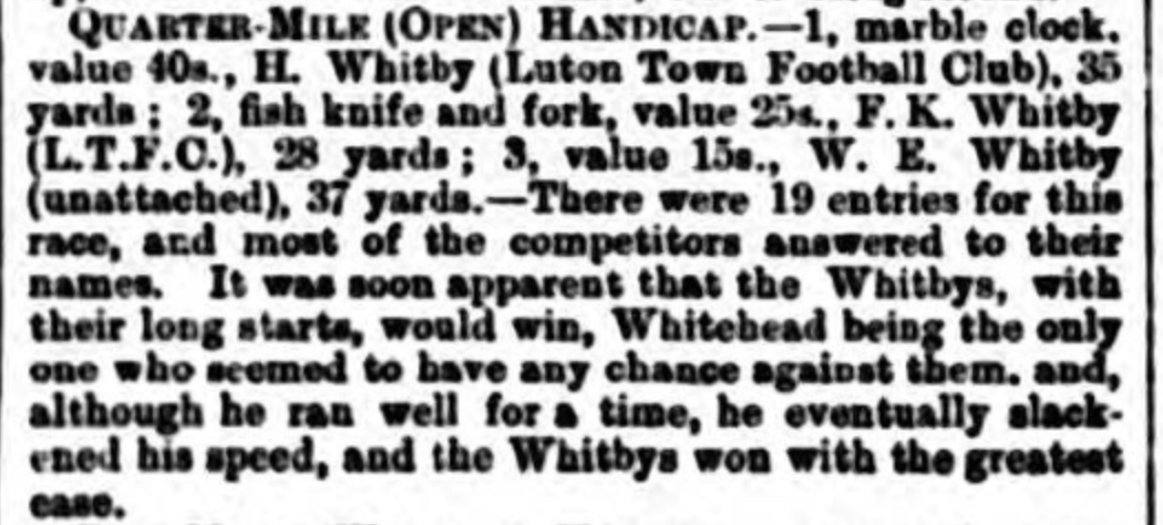 The good turn of speed was prevalent in all the Whitby brothers as they won many races in the district as shown below from the Luton Reporter of 25th June 1887.