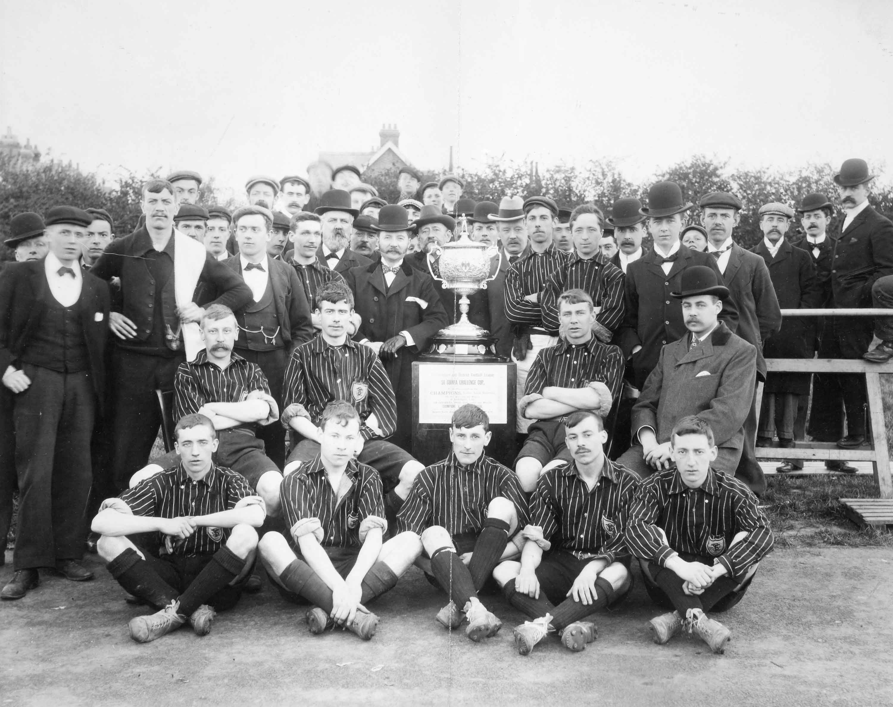 Although the ball in the photo above says this is the 1898/99 team, the players are not wearing the first team shirts.  The club committee had changed colours to black with narrow white stripes, as shown in the photo below.
