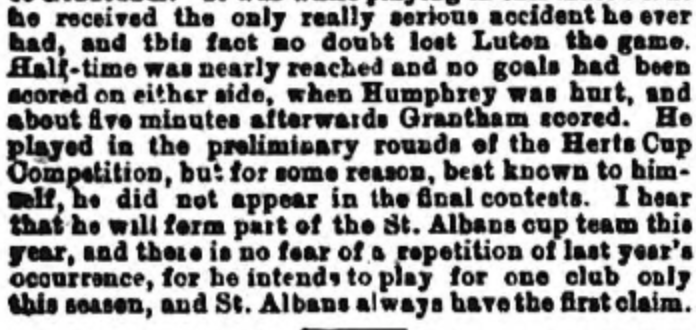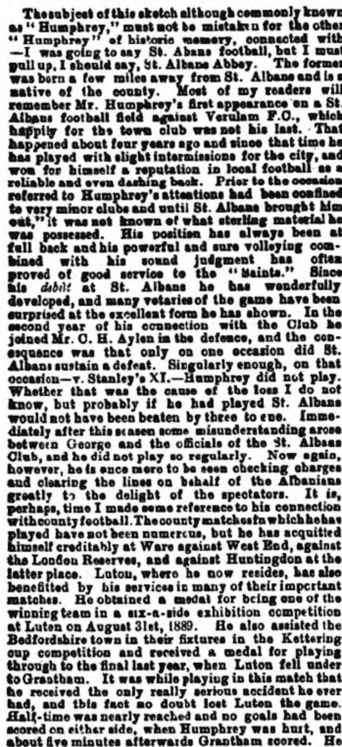 “Passing on to speak of his performances the writer remarks:- The county matches in which he has played have not been numerous, but he has acquitted himself creditably at Ware against West End, against London Reserves, and against Huntingdon at the latter place.  Luton, where he now resides, has also benefitted by his services in many of their important matches.  He obtained a medal for being one of the winning team in a six-a-side exhibition competition at Luton on August 31st, 1889.  He also assisted the Bedfordshire town in their fixtures in the Kettering cup competition and received a medal for playing through to the final last year, when Luton fell under to Grantham.  It was while playing in this match that he received the only really serious accident he ever had, and this fact no doubt lost Luton the game.  Half-time was nearly reached and no goals had been scored on either side, when Humphrey was hurt, and about five minutes afterwards Grantham scored.  I hear that he will form part of the St. Albans cup-team this year, and there is no fear of a repetition of last year’s occurrence, for he intends to play for one club only this season, and St. Albans always have first claim.”