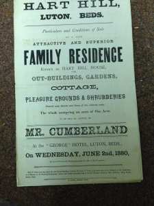 Hart Hill House – As our readers are aware Hart Hill estate has been recently purchased by Messrs J.R. Brown and Humphreys and laid out for the erection of villa residences. On his removal to London, Mr A.P. Welch, J.P., is about to leave Hart Hill house, and it was offered by auction on Wednesday at the George hotel, by Mr Cumberland. Detailed and elaborate plans and particulars were issued, containing besides the usual coloured lithographs, a pair of chromos showing the house and terraces from two aspects. A numerous company assembled, considerable local interest being taken in the sale, although it was hardly expected there would be local purchaser. Mr Cumberland said he had the honour of submitting one of the most charming residences in Luton. Hart Hill House was unique – there was nothing to match it in Luton or the county, from the beauty of its position and surroundings. It had been occupied for some years by Mr Welch, who had expended upon it a large sum to bring it to its present state of perfection. It was one of the most perfect places that could be found both internally and externally. From its elevated situation there were extensive and pretty views, and yet it was within an easy distance of both railway stations. It was sheltered from the east and north-east winds. The fittings of the house were of the completest description, and on taking possession of it there would nothing required to be done. Such a house was not offered above once in a lifetime. A number of things were amongst the fixtures beyond those ordinarily included, the value of which would be several hundred pounds. The property was divided into four lots, the sale of the other three being contingent on the first being disposed of, as the purchaser of that lot would have the other offered him at a very moderate fixed price. Various roads and paths were laid out on the estate, and with a view to their maintenance, and that they might be kept private, there were special covenants to be entered into. These he asked Mr W. Austin representing F.C. Scargill, Esq., to read and explain, which was being done, Mr Cumberland read the particulars and expatiated upon them. At the end a bidding was asked. £1,000 was suggested, but the auctioneer said it was no use to begin so unreasonable low and named £1,500. From this point to £2,000 the biddings slowly rose by hundreds, after which twenties were taken to £2,400, and then tens to £2,450 when it was bought in, the reserve not being reached. It was stated that the house had cost considerably over £3,000, exclusive of the land and outbuildings, and the expenditure on grounds etc.