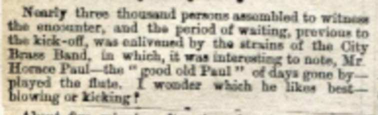 “it may be interesting to my readers to know that Mr Paul first played for St. Albans in 1883, and in 1886 the reputation he had gained as half-back brought him to the attention of the county executive, and that year he was chosen to play for Herts. versus Hunts. at St. Neots. In the following year he again played for Herts. versus Northants at Wellingborough, and in 1888 he figured in the county team against London reserves at Ware. At Easter 1889, the St. Albans club in recognition of his valuable services gave him a benefit match, the popular fixture with the London Caledonians being chosen for the purpose. Mr Paul, says the writer, has from the very commencement of his career as a footballer always played in the position of centre half-back. Although there is nothing particularly brilliant in his style of play, he possesses the essential qualifications of a half-back, being a sure tackler and a hard worker. The principal characteristic about his play, however, is his heading. There are very few footballers in the county who can use their heads with such effect as he can; many a goal has been obtained for St. Albans by heading the ball through from a corner kick.”