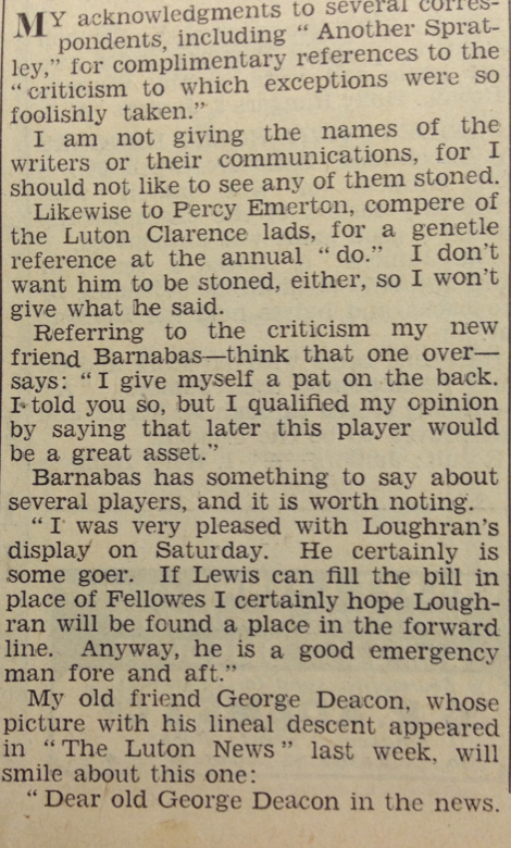 The following two clips demonstrate the perils of relying on memories many years later. The first is from the Luton News of the 21st February 1935 and talks of good humour at a game with Swindon. The following week came a letter from a correspondent with the opposite recollection. The Croft was Swindon’s ground.